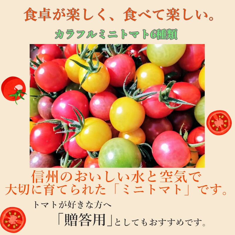 ミニトマトの種類は、華オーバル、華コロコロ(赤)、ピンキー(桃)、イエローミミ(黄)、オレンジ千果(橙)、サングリーン(緑)、トスカーナバイオレット(茶紫)です。